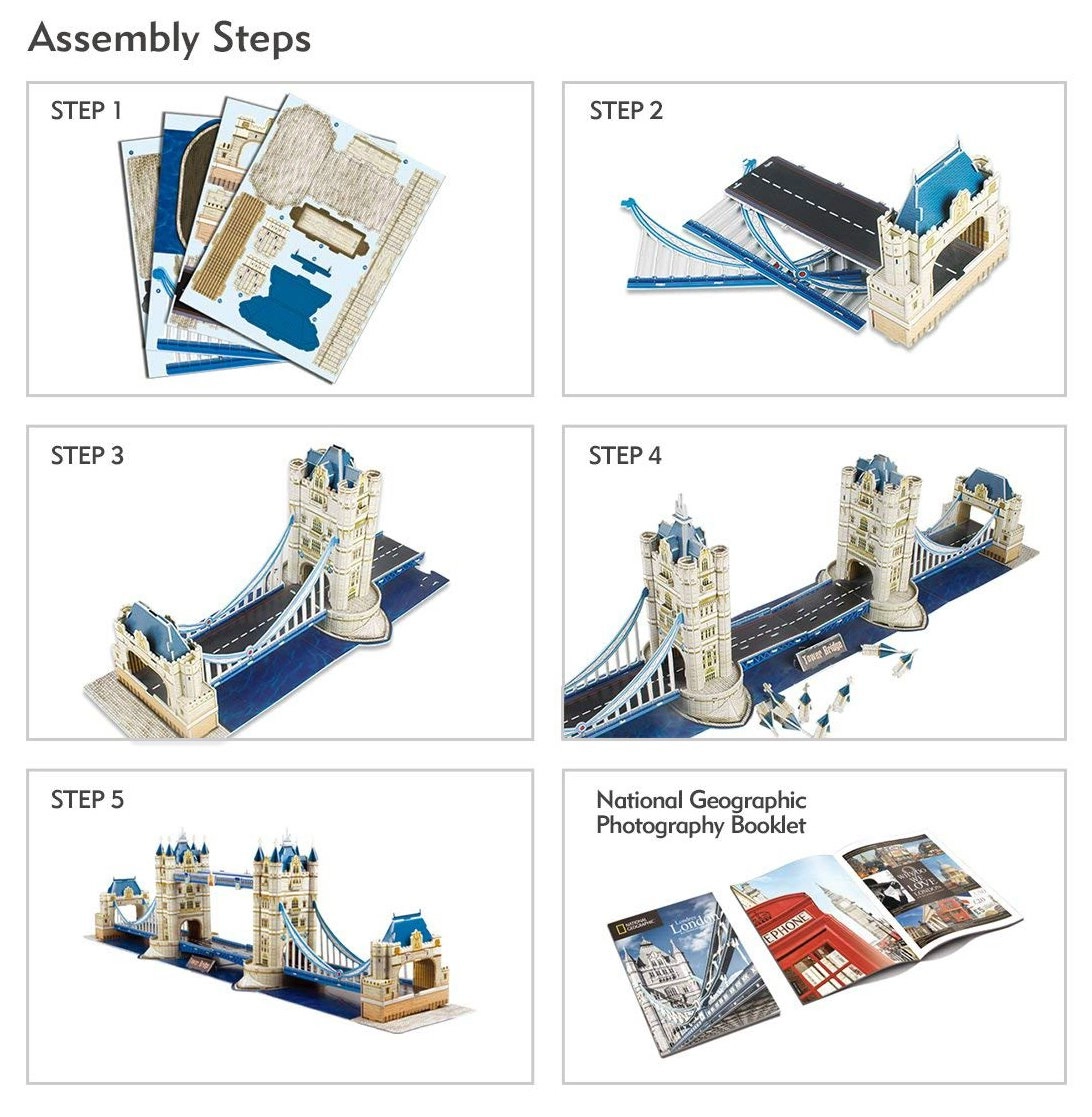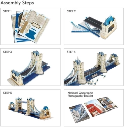 Открийте Лондон чрез сглобяването на един от най-известните му символи – Тауър Бридж. 3D пъзелът от серията National Geographic на CubicFun предлага реалистична изработка, прецизни детайли и приятното изживяване от строителство без необходимост от лепило. Частите от приблизително 3 мм пяна с ламиниран печат осигуряват здравина и красив вид на готовия модел.