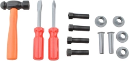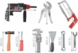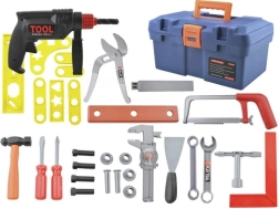 Комплект детски инструменти в здраво куфарче за малки майстори от 3 години. Съдържа реалистични пластмасови инструменти като бормашина с въртящо се свредло, трион, чук, отвертки, клещи, комплект ключове, шублер и други аксесоари. Комплектът развива фината моторика, креативността и учи на отговорност по време на игра. Куфарчето държи всичко подредено както у дома, така и при пътуване.