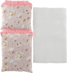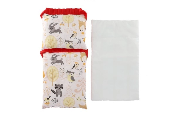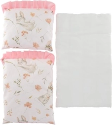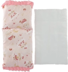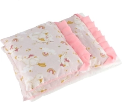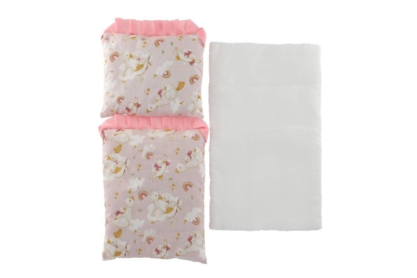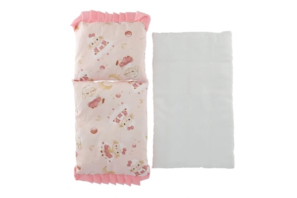 Практичният комплект за кукли съдържа всичко необходимо за удобно „сънче“: мека завивка, пухкава възглавничка и подложка. Благодарение на фините материали и игривите мотиви подхожда на всяка детска стая и насърчава развитието на въображението и ролева игра.