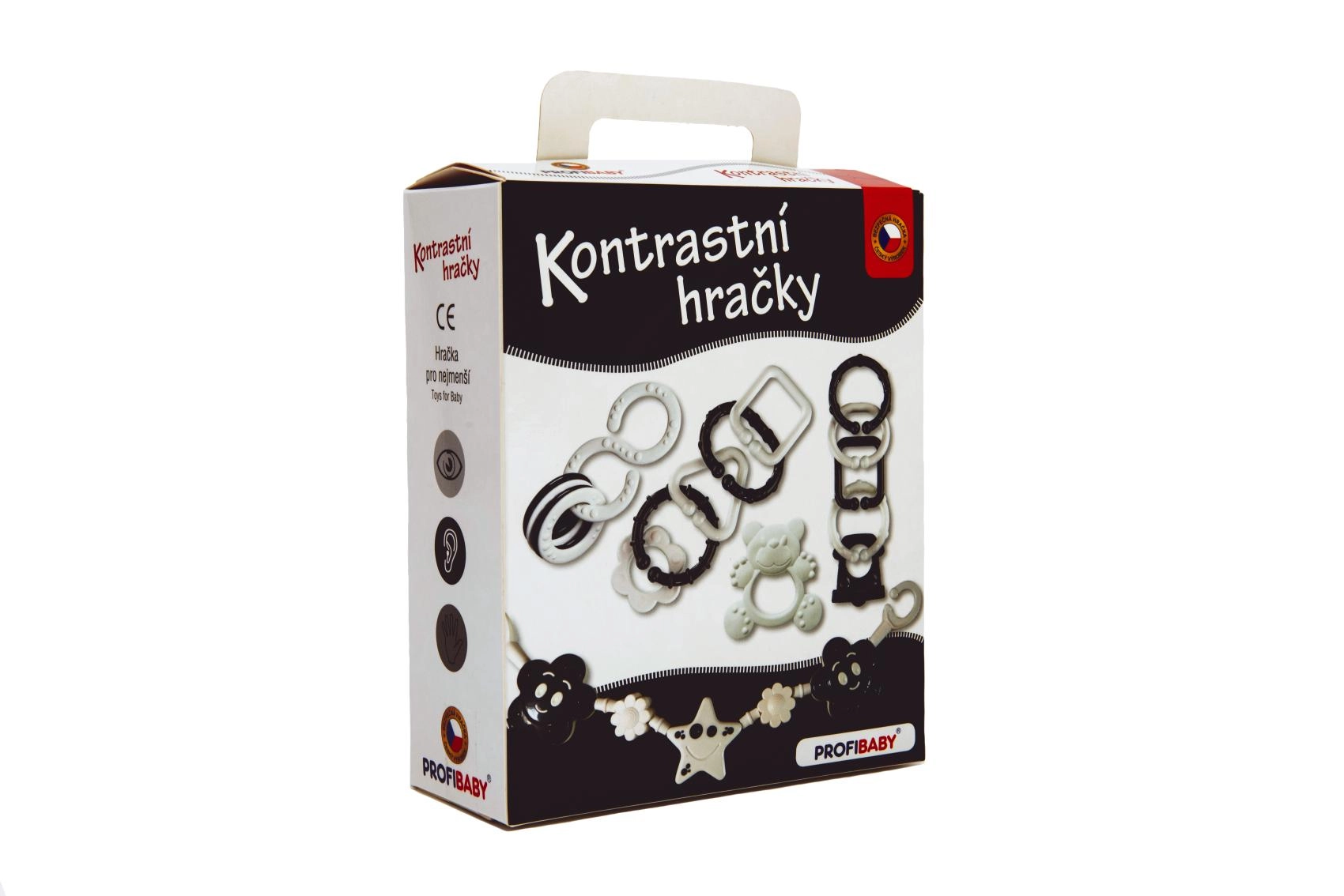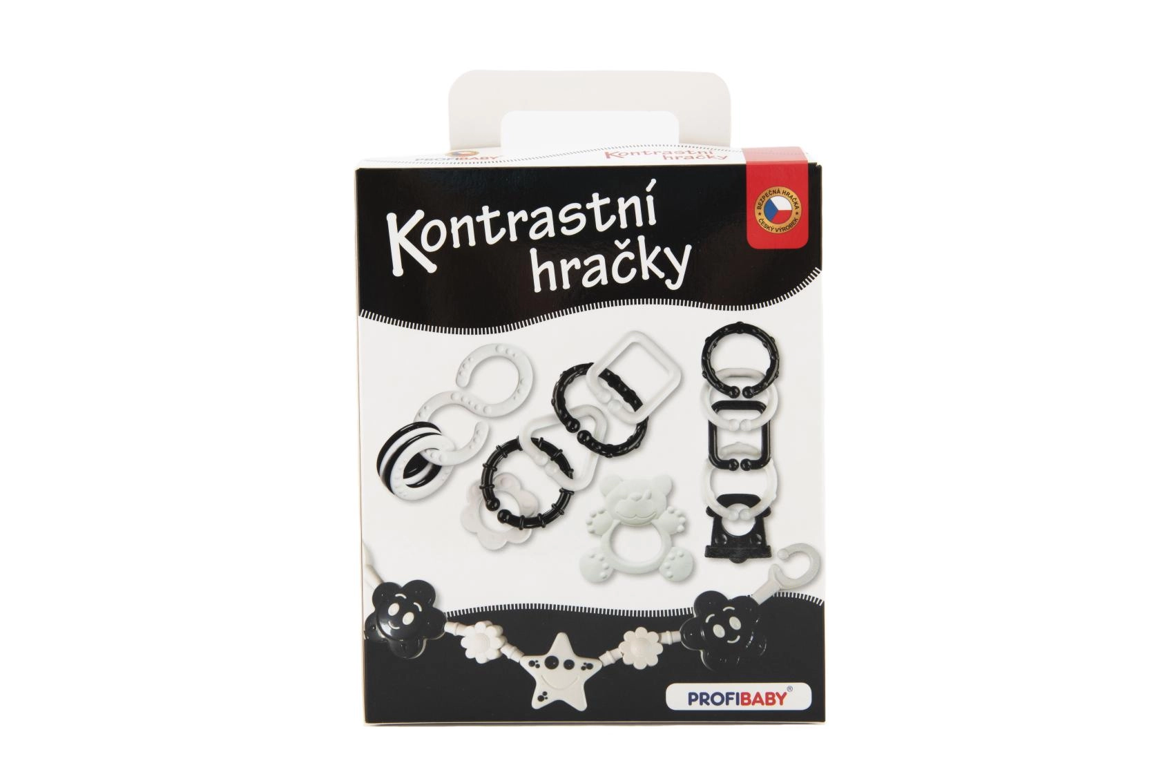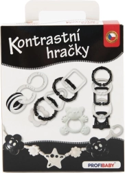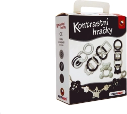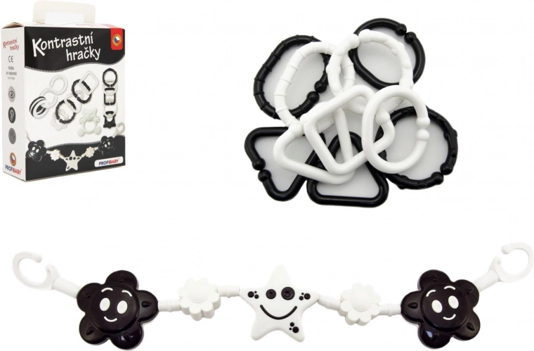 Този контрастен комплект в черно-бял вариант е създаден за най-малките бебета, които все още не различават цветовете. Висококонтрастните шарки естествено привличат вниманието и подпомагат зрителната стимулация и концентрацията. Благодарение на добре премислените форми играчките са лесни за хващане с малка ръчичка и помагат за трениране на хватателния рефлекс и координацията око–ръка.