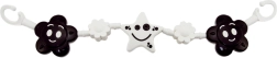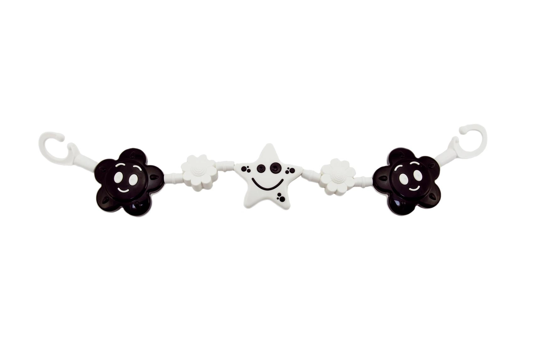 Черно-бялата висяща бариера с цветя и звездичка привлича вниманието на бебето и го забавлява по време на разходки. Лесно закрепване с куки към количка или креватче.