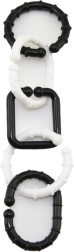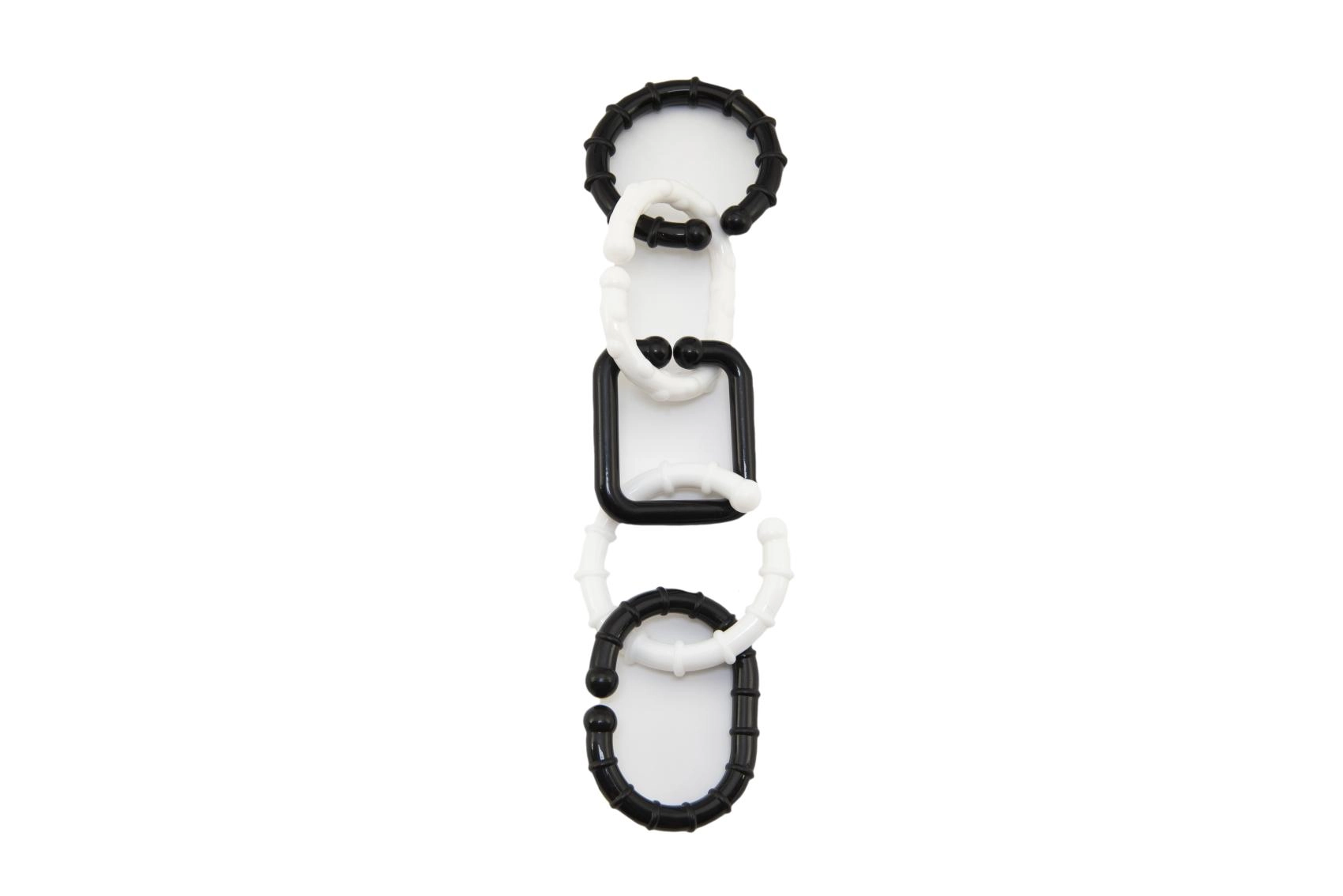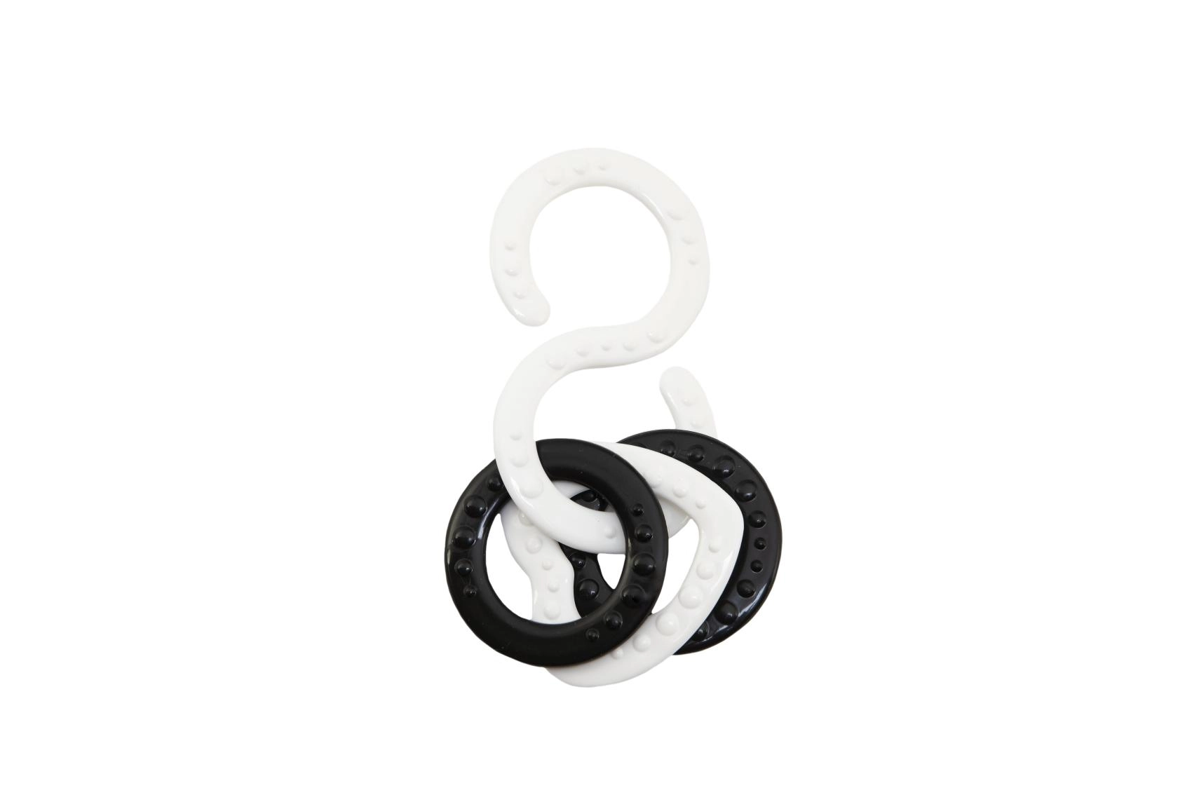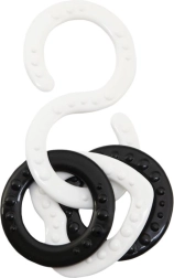 Свързващи се силиконови халки с релеф масажират венците, стимулират осезанието и улесняват хващането. S-образни куки закрепват играчките към количка или столче за кола.