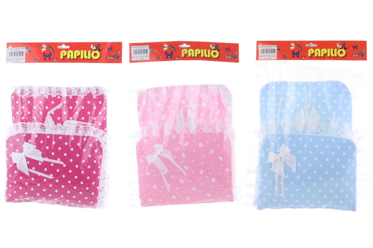 Този елегантен комплект завивка и възглавничка за кукли е създаден за удобно и стилно приспиване на любимите играчки. Фината дантела и панделката придават очарователен вид, който чудесно допълва количката или легълцето за кукли.