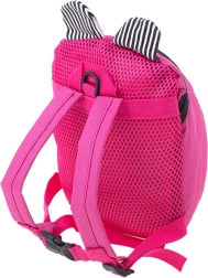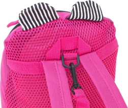 Очарователна детска раничка във форма на мече с райирани ушички ще зарадва всеки малък откривател. Тя е лека, удобна и има регулируеми презрамки за перфектно напасване. Основното отделение с цип събира всички дребни вещи за детската градина и разходки, а включеният сваляем предпазен ремък осигурява по-спокойни разходки.