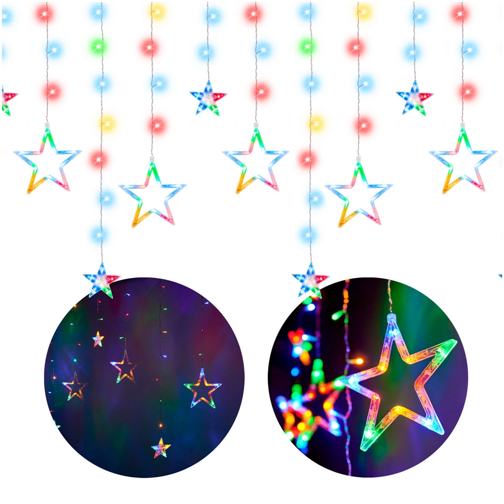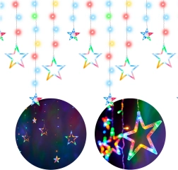 Внесете празнична магия у дома с LED светлинна завеса със звезди с дължина 2,5 m и 138 LED. Осигурява многоцветно осветление, 8 светлинни режима и захранване от мрежата за непрекъсната работа без батерии. Идеална като празнична декорация и уютно вечерно осветление през цялата година.