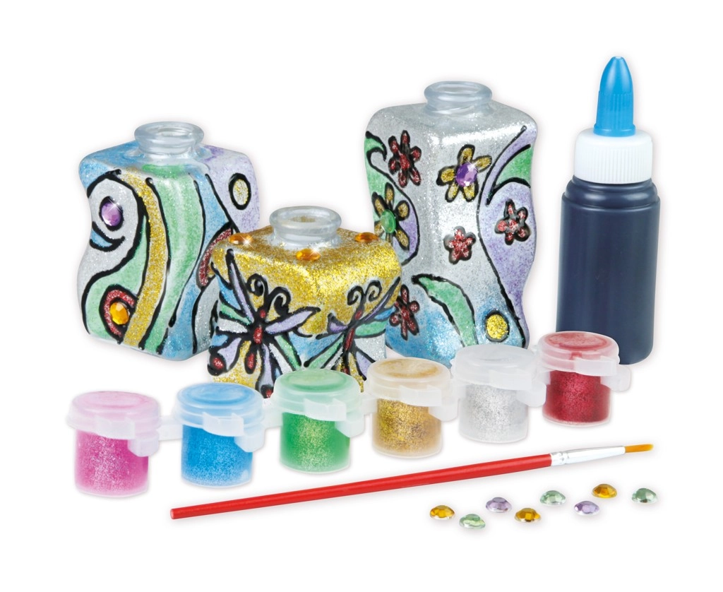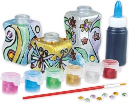 Открийте забавното творене с креативния комплект за рисуване върху стъкло. Комплектът съдържа всичко необходимо за създаване на оригинални декорации – 3 вази, 6 блестящи цвята, четка, декоративни камъчета и моделираща маса. Подпомага креативността, фината моторика и развитието на детското въображение.