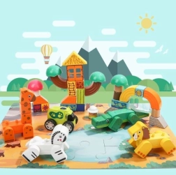 Пъстрите дървени кубчета позволяват сглобяване на офроуд превозно средство, сгради и сладки животни. Детайли като цветя и арка придават на играта уникален чар.