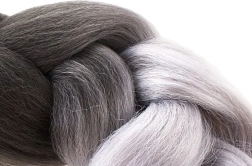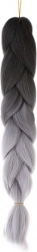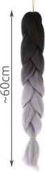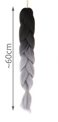 Високотемпературно устойчивото влакно е устойчиво на UV лъчи и високи температури, което позволява оформяне със сешоар, преса или маша, както при естествената коса. Спецификацията на продукта включва черно-сив цвят, синтетичен материал и дължина приблизително 60 см.