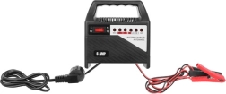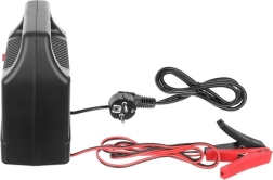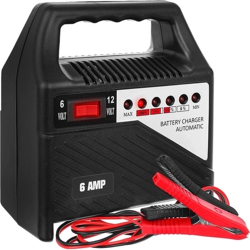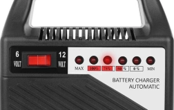 Практичната дръжка, компактните размери и ниското тегло улесняват съхранението и пренасянето. С превключвател избирате правилното напрежение (6 V / 12 V), а здравите щипки осигуряват надежден контакт с полюсите на батерията.