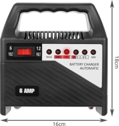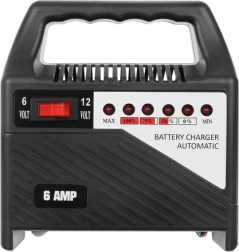 Компактно автоматично зарядно за батерии 6 V и 12 V с заряден ток до 6 A. Идеално за автомобилни батерии, мото батерии и оловно-киселинни акумулатори 20–65 Ah. Предлага превключвател на напрежение, LED индикация за нивото на заряда и ниско тегло за лесно пренасяне.