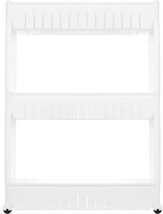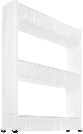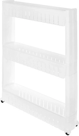 Тази мобилна кухненска етажерка на колелца е перфектна за използване на тесни пространства между шкафове. Изработена е от издръжлива пластмаса и съдържа три дълбоки рафта за организиране на необходимите предмети.