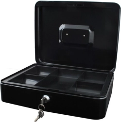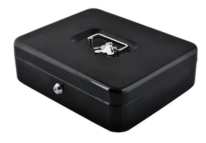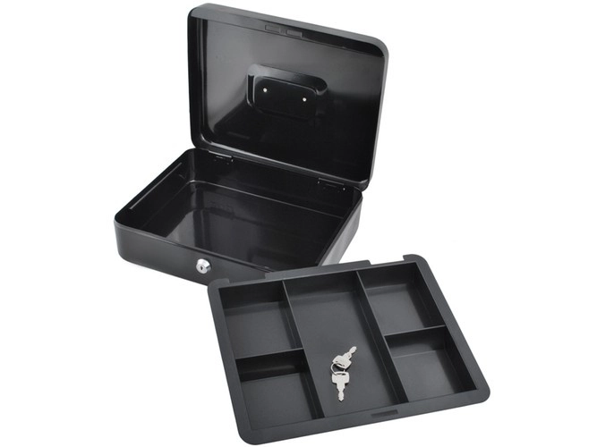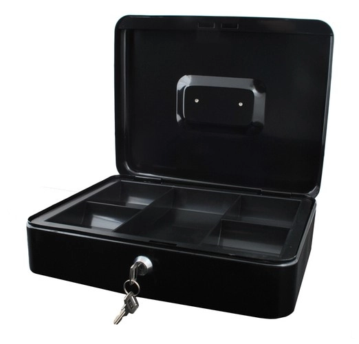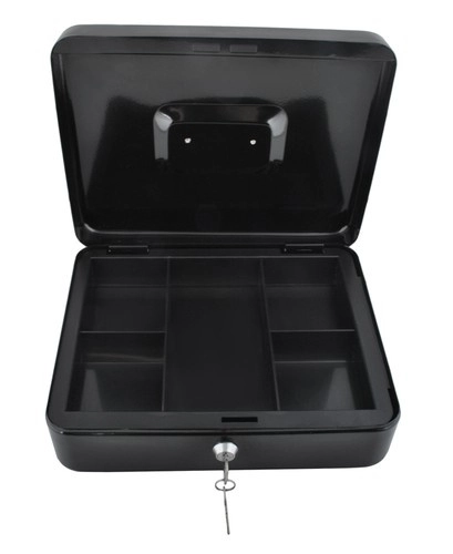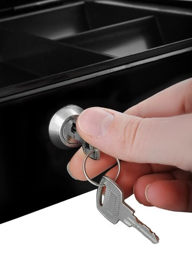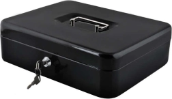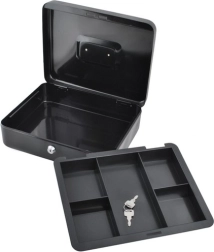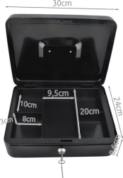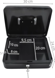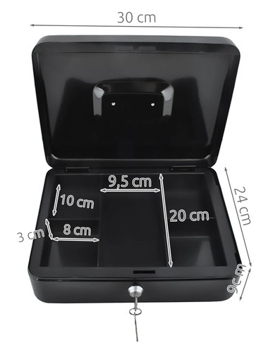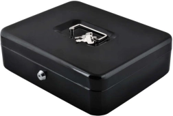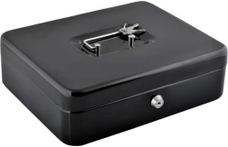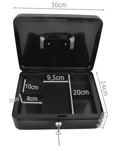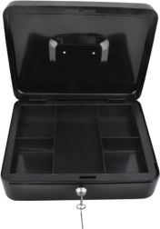Практична каса в голям формат надеждно защитава налични пари, документи и дребни ценности. Благодарение на ключалка с ключ, устойчива стоманена конструкция, вътрешен органайзер с отделения и сгъваема дръжка е идеална за дома, офиса и търговски събития.