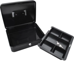 Вътрешната пластмасова вложка от PP предлага прегледно подреждане на монети и банкноти. Вградената хромирана дръжка улеснява пренасянето и позволява стифиране на няколко каси една върху друга – практично решение за касови зони, пазари и офиси.