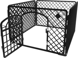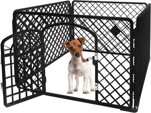 Практичен и универсален заграден кът за кучета, кученца и дребни животни, който осигурява на вашия любимец безопасно пространство у дома и в градината. Благодарение на здравата пластмасова конструкция от PP и металните съединения заграждението е стабилно, издръжливо и лесно за монтаж. Вратичката с сигурно заключване предотвратява неволно излизане, а заоблените елементи повишават безопасността при употреба. Идеално за тренировки, отдих и защита на домашното обзавеждане.