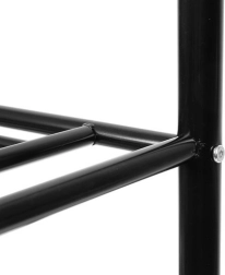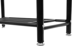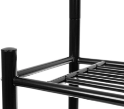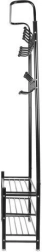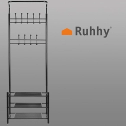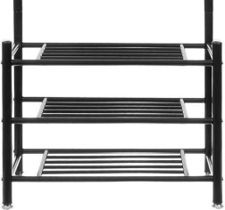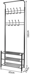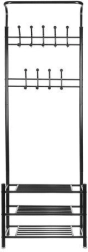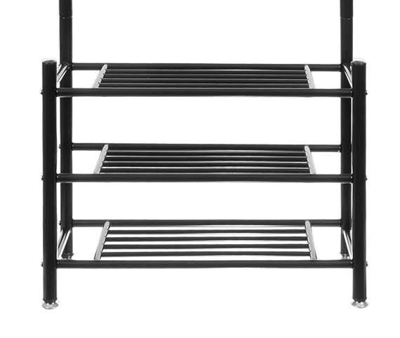 Практичната стояща закачалка комбинира горна рейка с куки и три долни рафта за обувки, чанти или кутии. Благодарение на тънкия си профил е идеална за антре, коридор и спалня, където предлага бърз достъп до често използвани вещи.