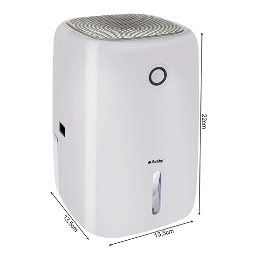 Компактният обезвлажнител за въздух RUHHY с технология на Пелтие предлага тиха работа 30 dB, висока ефективност до 330 ml/ден и голям 800 ml резервоар за до 60 часа непрекъсната работа. Без химически пълнители, с автоматично изключване при напълване и ниска консумация 22,5 W за комфортна и здравословна домашна среда.