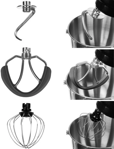 Към робота са включени три различни приставки: бъркалка, кука за тесто и плоска бъркалка. Незаменими инструменти за перфектна подготовка на теста, кремове и всичките ви любими изкушения. Освен това комплектът включва стилни аксесоари като сладкарски пош, накрайници и разделител за яйца.