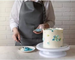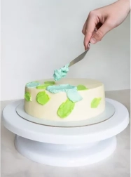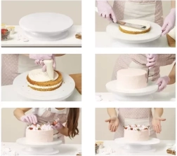 Оборудвана с подвижна основа за лесна манипулация, въртящият механизъм позволява плавно въртене и в двете посоки, което улеснява нанасянето на глазура и други декорации. Добавените три декоративни шпатули имат различни шарки, които позволяват да създавате уникални и креативни повърхности върху вашите торти.