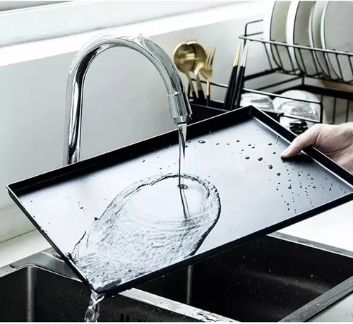 Гладката пластмасова подложка улавя стичащата се вода и държи работната повърхност суха. След ползване просто я изплакнете под течаща вода – поддръжката е въпрос на минути.