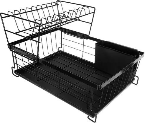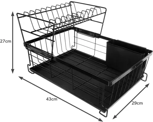Тази двуетажна сушилка за съдове ефективно използва пространството на плота: горният етаж побира до 9 чинии, а долният е идеален за купи, чаши и халби. Конструкцията от въглеродна стомана с издръжливо покритие е устойчива на влага и ежедневна употреба, докато противоплъзгащите крачета осигуряват стабилност и безопасност дори при по-голямо натоварване.