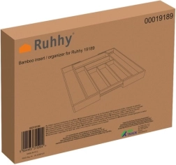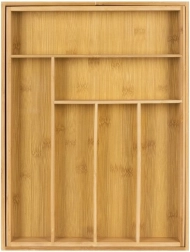 Подредете прибори, ножове и кухненски пособия с вечния бамбуков органайзер RUHHY. Благодарение на разтегаемите странични части получавате гъвкаво разпределение с 6–8 отделения, което лесно се адаптира към съдържанието и ширината на чекмеджето. Естественият материал се отличава с издръжливост, бързо съхнене и естетичен вид, който пасва на всяка модерна кухня.
