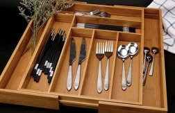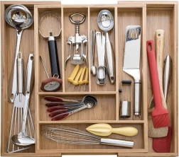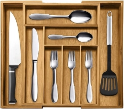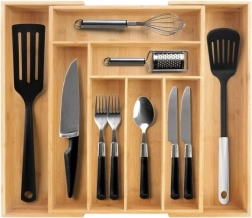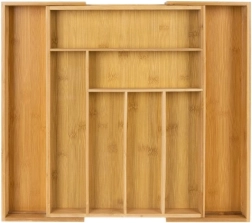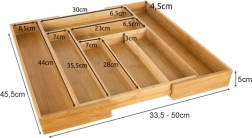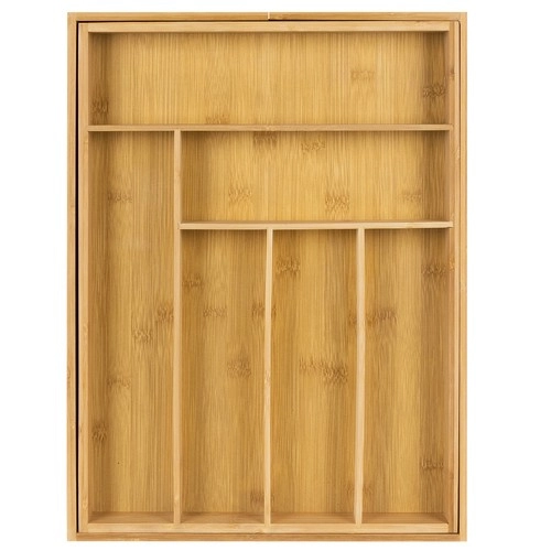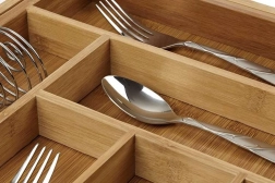 Органайзерът е проектиран да държи вещите подредени на мястото им и едновременно да улеснява ежедневната употреба. Гладката бамбукова изработка намалява полепването на замърсявания и позволява лесна поддръжка под течаща вода. Практичната височина и разпределението на отделенията осигуряват удобно съхранение на лъжици, вилици, ножове и дребни аксесоари.