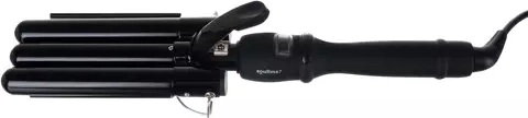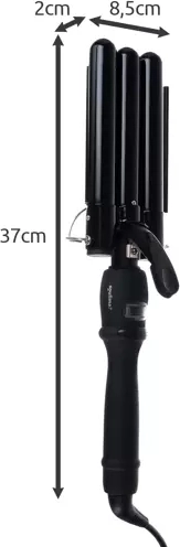 Тази тройна маша с диаметър на цилиндрите 22 mm създава равномерни, естествени вълни за миг – достатъчно е да поставите кичура, да притиснете и да преместите. Керамичният PTC нагревателен елемент осигурява бързо и равномерно загряване и щадящ контакт с косъма без излишно прегряване.