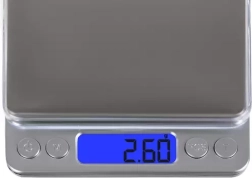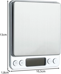 Търсите прецизно измерване дори при съвсем малки количества? Тази цифрова кухненска везна от неръждаема стомана с пластмасов корпус предлага точност 0,01 g и максимален капацитет 500 g. Благодарение на синьо осветения LCD лесно ще отчитате стойностите при всякакви условия, а функцията TARE ви позволява да теглите продуктите директно в купа без сложно преизчисляване.