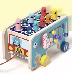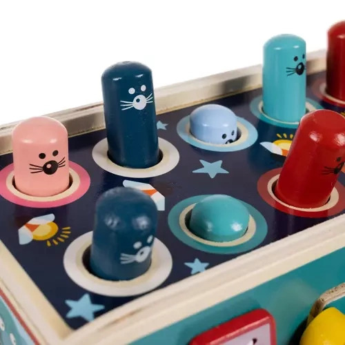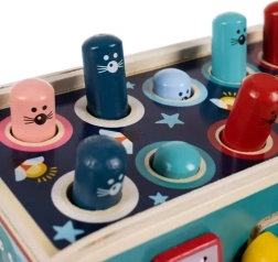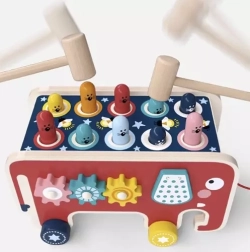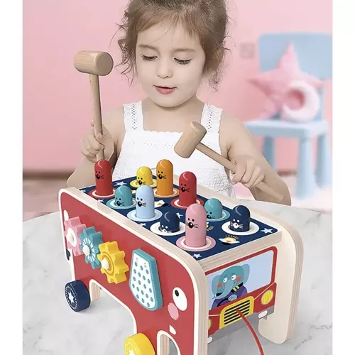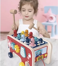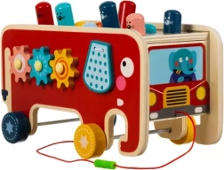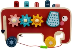 Тази играчка подпомага развитието на фината моторика и концентрацията благодарение на интерактивни елементи като чукчета и зъбни колела.