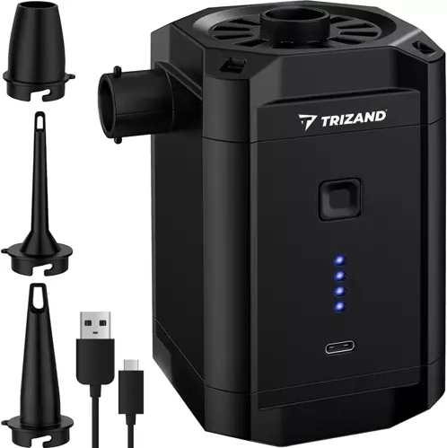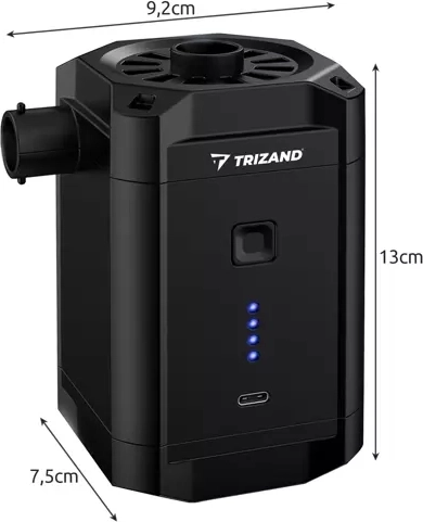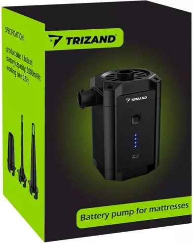 Безжичната акумулаторна помпа Trizand е полезен помощник за всяко пътуване. Благодарение на трите сменяеми накрайника се справя с надуване на матраци, топки, понтони и други надуваеми предмети. Тя е компактна и лесна за пренасяне, което я прави перфектен спътник за къмпинг или плаж.