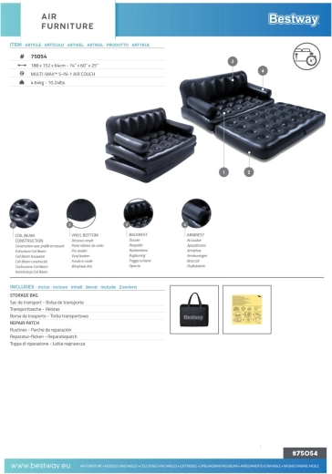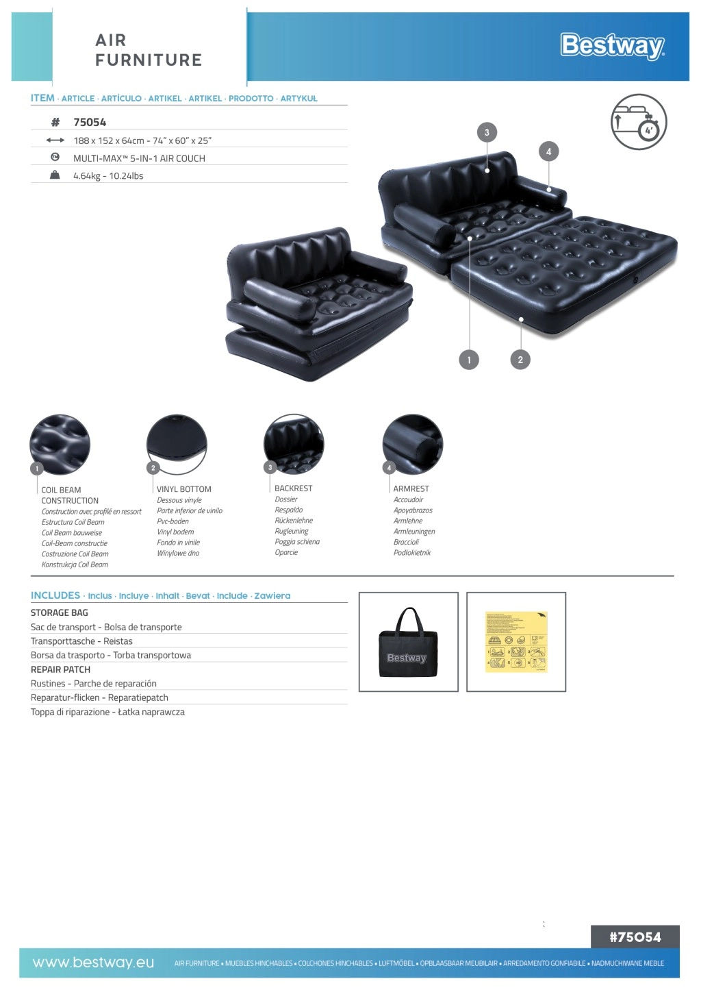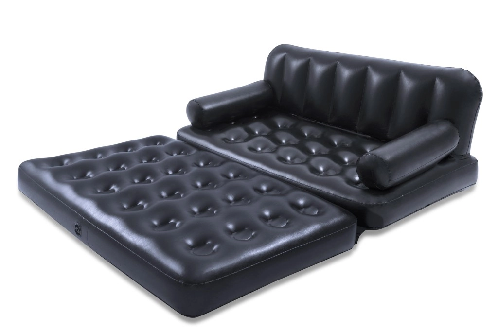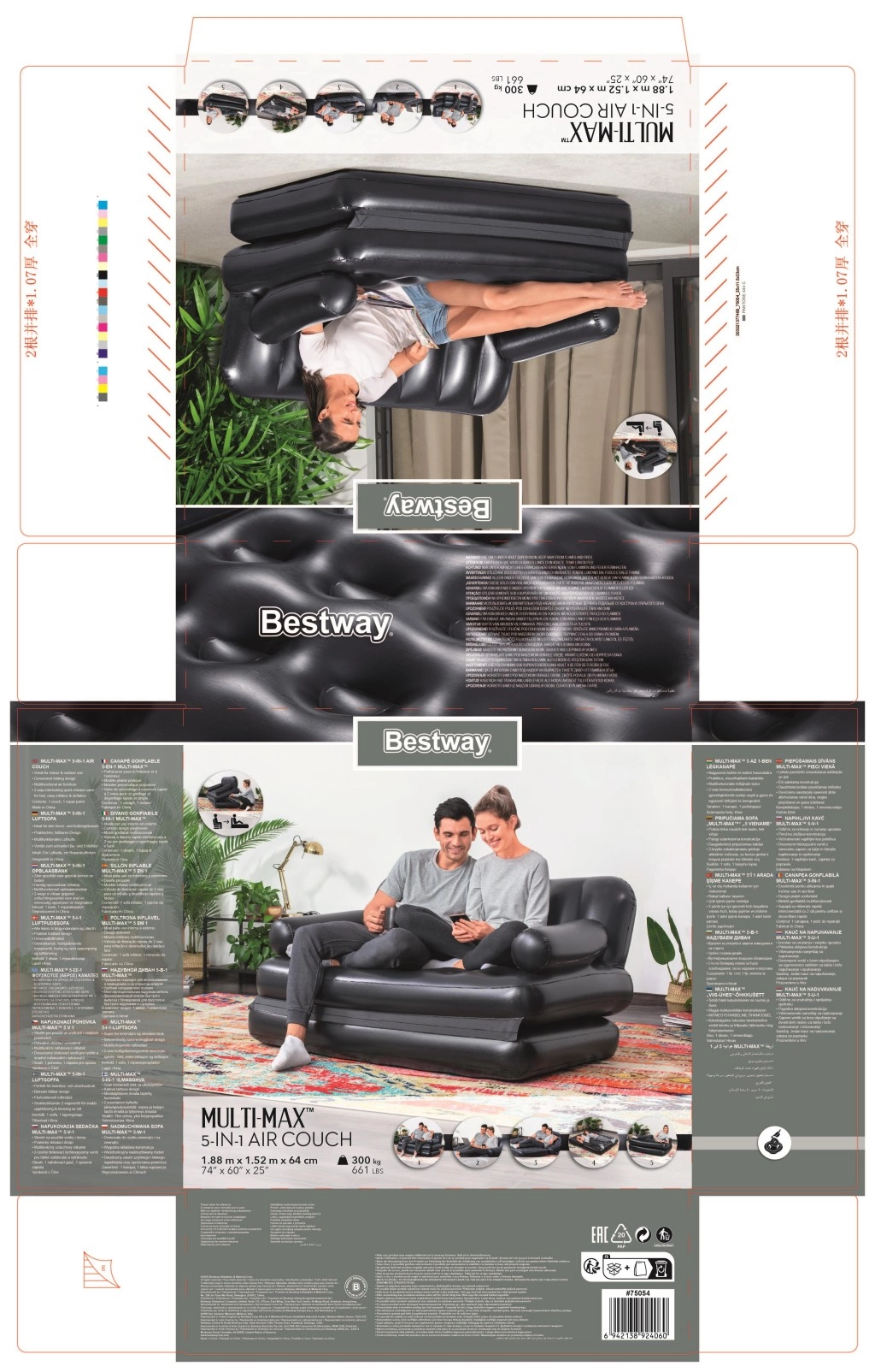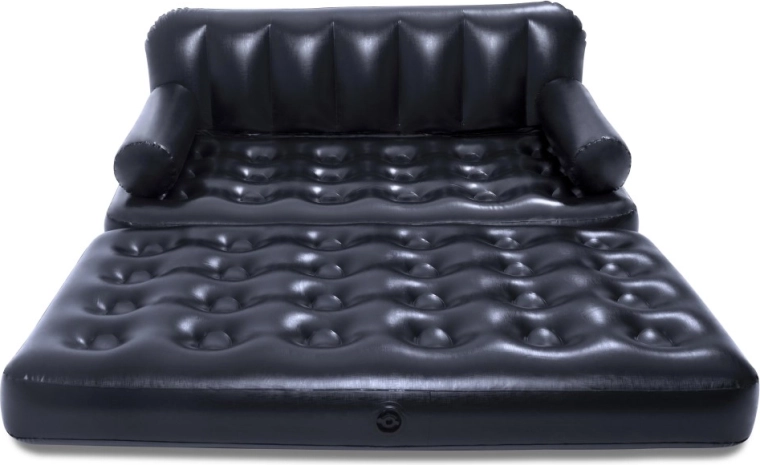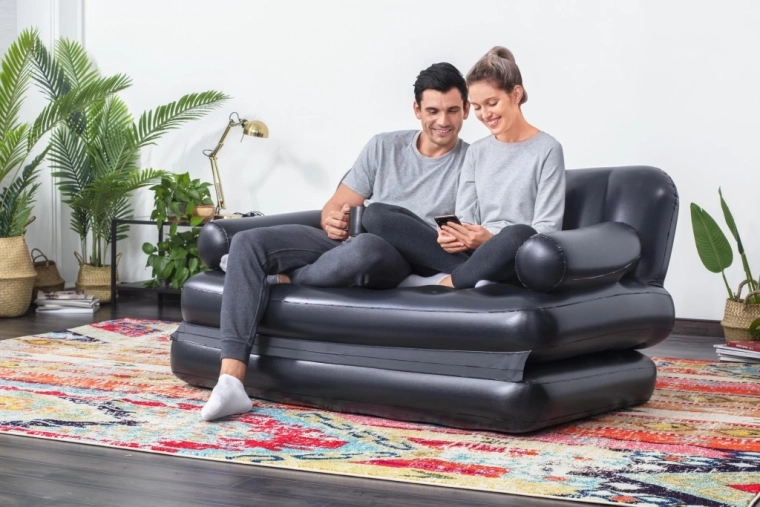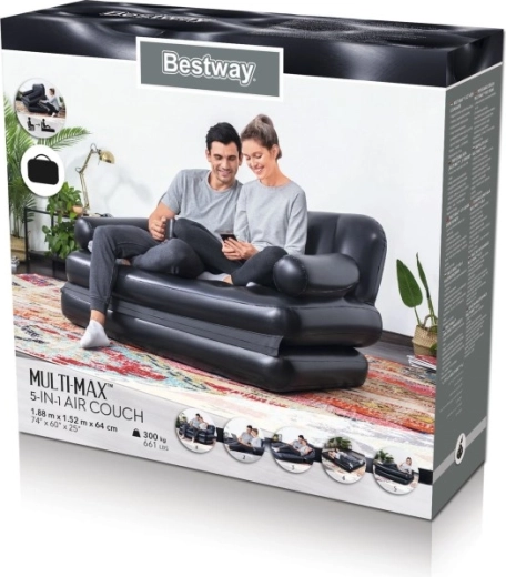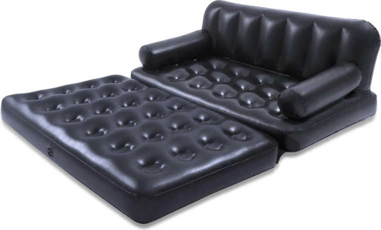 Универсален надуваем диван и легло 5в1 от марката BESTWAY предлага удобно сядане и спане за двама. Благодарение на издръжливото PVC, стабилната конструкция Coil Beam и бързовентила за изпускане се надува лесно, превръща се в шезлонг или двойно легло и след употреба бързо се изпуска. Идеален за интериор, за гости и за временно спане.