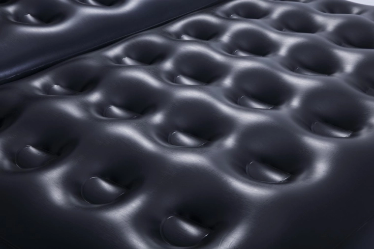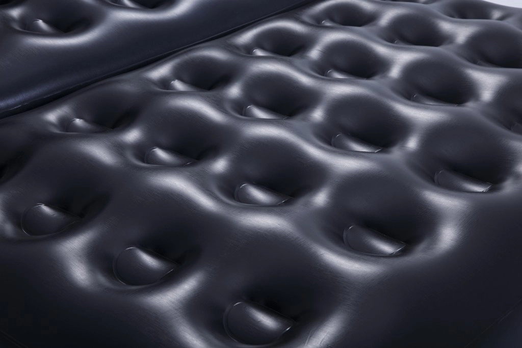 Този многофункционален надуваем диван 5в1 комбинира удобство, практичност и компактни размери. Служи като двуместен диван, релакс кресло, шезлонг и двойно легло със стабилна опора. Мекият горен слой и включените цилиндрични възглавници увеличават комфорта при седене и спане.