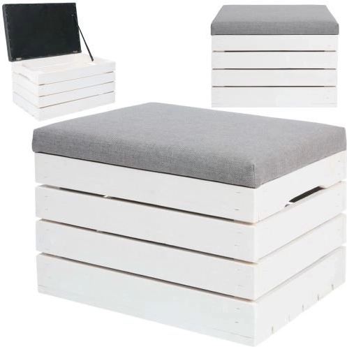 Открийте универсалната пуф табуретка с място за съхранение, която пести място и поддържа домакинството подредено. Повдигащият се капак със седалка осигурява бърз достъп до съхраняваните вещи, а неутралната комбинация от бяло дърво и сива тапицерия се вписва в модерни и класически интериори.