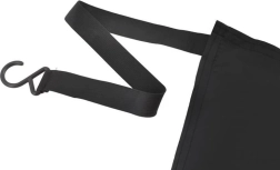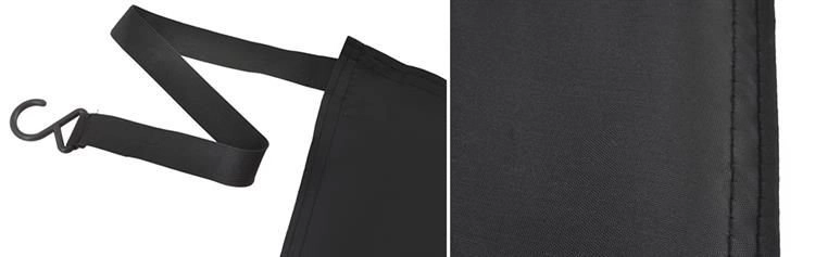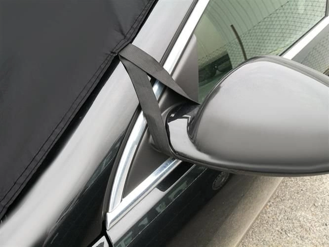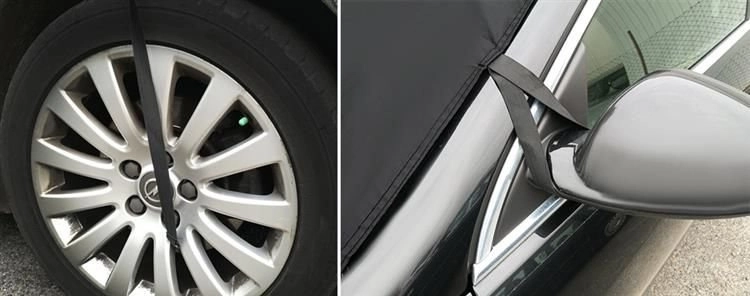 Еластичните ленти с куки се фиксират към огледалата и колелата, а краищата се застопоряват с вратите. Сенникът прилепва към стъклото и устоява на вятър.