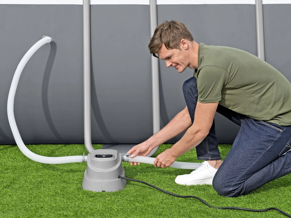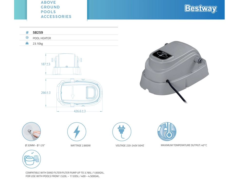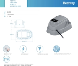 Инсталацията е лесна – просто свържете подгревателя към филтрационната система на басейна. Устройството е предназначено за надземни басейни с обем 1 520–17 035 l и дебит на помпата до 3 785 l/h. Максималната температура е 40 °C (постижима според входната температура на водата и околната среда). Здравата конструкция и дългият захранващ кабел 3,5 m улесняват разполагането и експлоатацията.