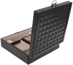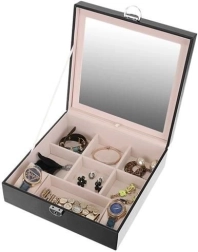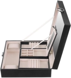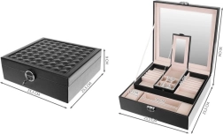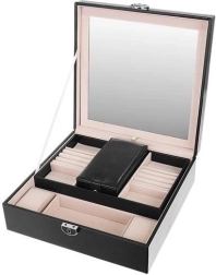 Тази кутия за бижута е отличен избор за всяка любителка на бижута и модни аксесоари. Предлага няколко нива за съхранение, включително изваждаема пътна кутийка, което ѝ придава универсалност и практичност, ценни при пътуване. Интегрираното във капака огледало улеснява поставянето и корекциите на бижутата.