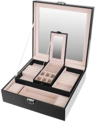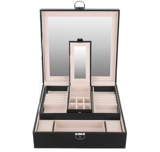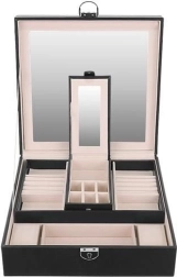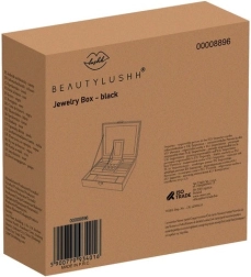 Елегантна кутия за бижута Beautylushh в черен цвят, идеална за организиране и защита на вашите ценности. С многостепенно пространство за съхранение и огледало, тя предлага всичко необходимо за подредено съхранение на бижута.