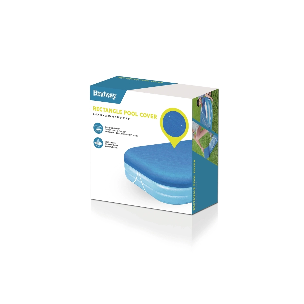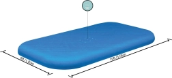 Покривалото е проектирано за правоъгълни басейни с размери 305 × 183 × 56 cm, собствените размери на покривалото са 328 × 209 cm за удобно прехвърляне през ръба. То е лесно за почистване, устойчиво на замърсяване и осигурява допълнително обезопасяване срещу нежелано падане на деца във водата.
