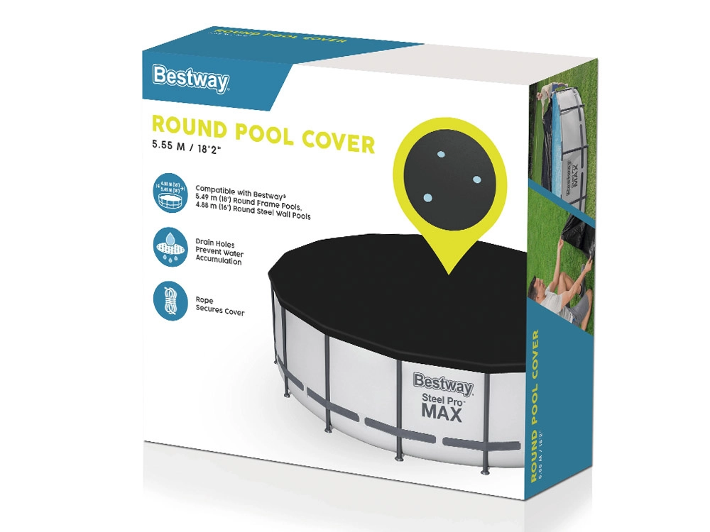 Защитното покривало Bestway е проектирано да осигури оптимална защита за вашия басейн. Благодарение на използвания здрав и плътен материал покривалото служи много сезони. Здравите фиксиращи въжета гарантират, че покривалото остава на мястото си дори при ветровито време, докато отводнителните отвори ефективно отвеждат излишната вода.