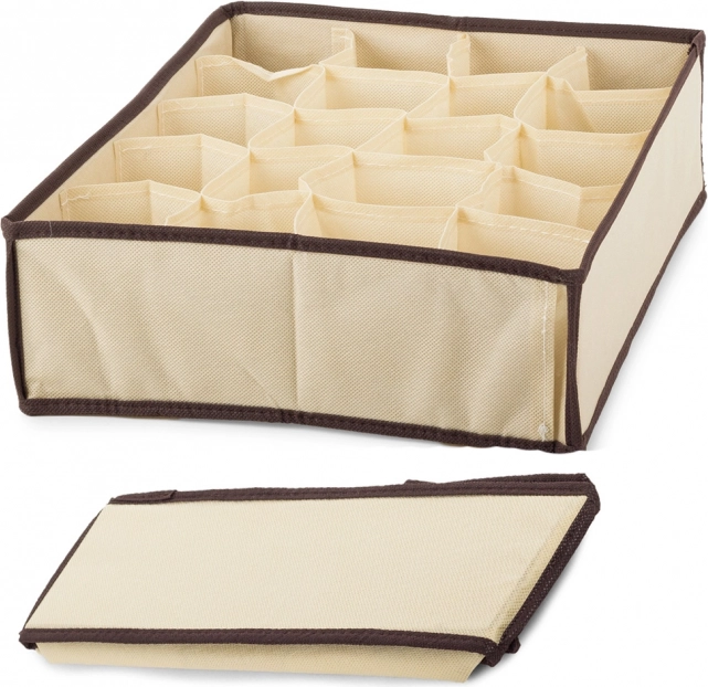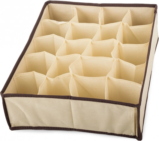 Този бежов органайзер е идеален за всички видове чекмеджета или може да бъде поставен на дъното на гардероб. Позволява лесно и практично подреждане не само на бельо, но и на чорапи, вратовръзки или колани, за да поддържате ред у дома. Благодарение на подсилените картонени страни и дишащия материал този органайзер е стабилен и същевременно лесен за поддържане в чистота.