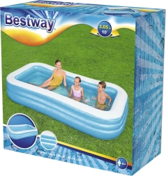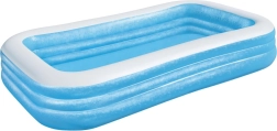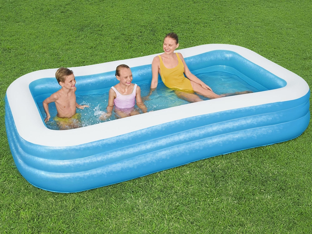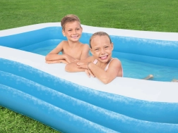 Надуваем басейн Deluxe Blue с размери 305 x 183 x 56 cm е идеален за лятно освежаване в градината. Изработен от издръжлив PVC материал, предлага комфорт и безопасност благодарение на широките странични стени.