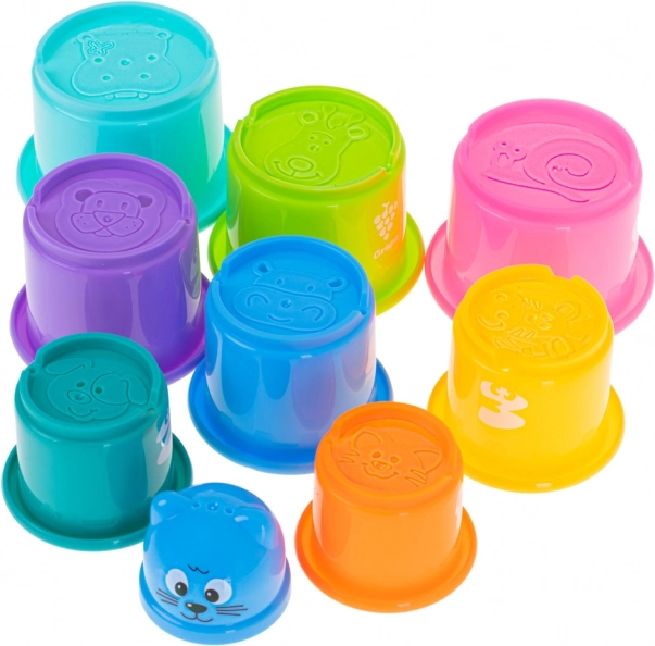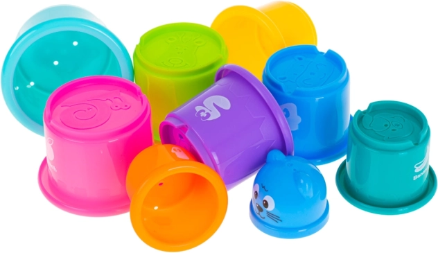 Чашките лесно се подреждат в висока кула или се прибират една в друга – отлична тренировка за координация и търпение.