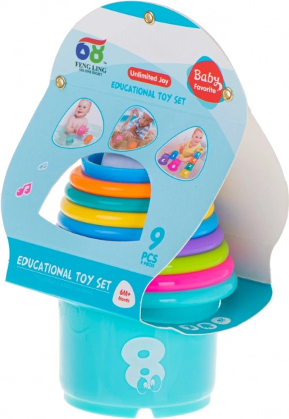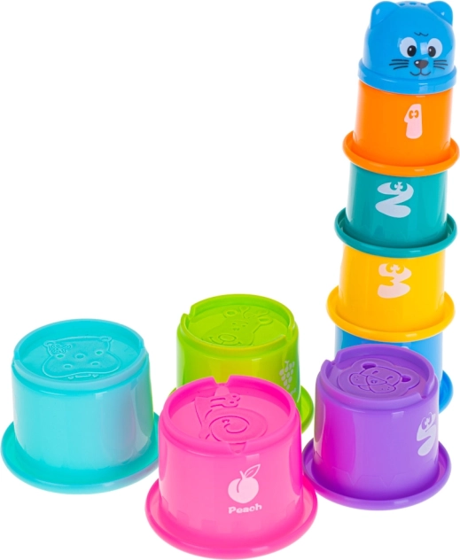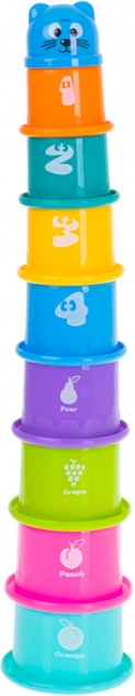 Този цветен комплект пластмасови чашки може да се подрежда на висока кула или да се вмъкват една в друга. Ярките цветове, приятните изображения на плодове и номерирането мотивират децата към игра, която развива координационните умения, прецизността на пръстите и логическото мислене. Английските надписи на плодовете по забавен начин запознават с чужд език.
