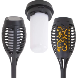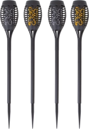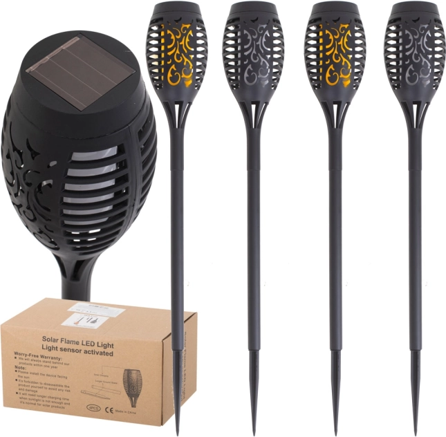 Създайте в двора си вълшебна атмосфера с комплект от четири соларни факелни лампи. Всяка лампа има 12 LED, които създават ефект на трепкащ пламък и се включват автоматично след стъмване. Соларно захранване без кабели, лесен монтаж в земята и топла, декоративна светлина за пътеки, лехи и беседки.