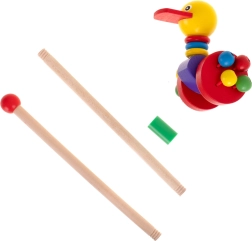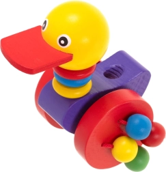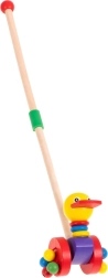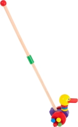 Това цветно дървено патенце е идеалният спътник за разходки. Проектирано е така, че да подпомага детската моторика и движение. Благодарение на лесно управляемата дървена пръчка патенцето може да бъде водено или децата могат да играят самостоятелно с него.