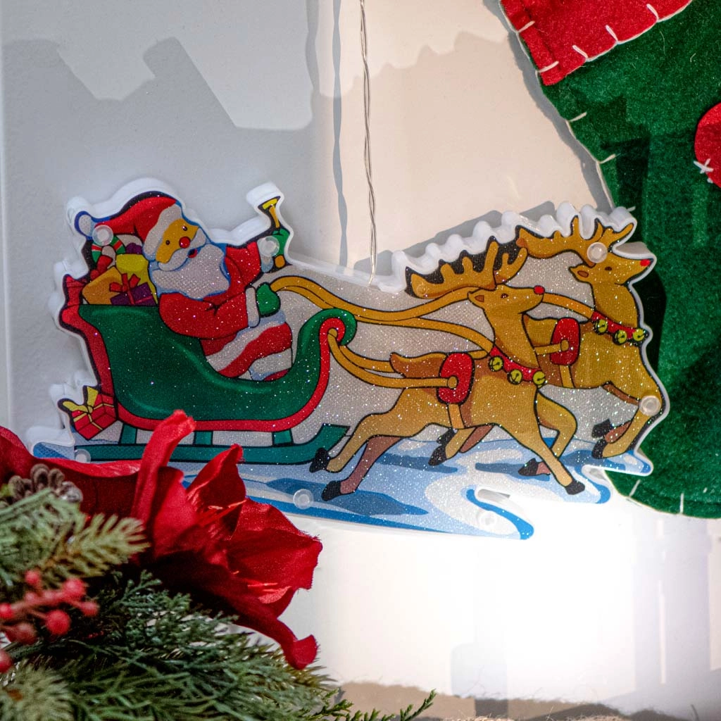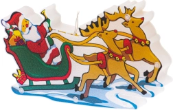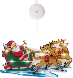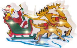 Тази цветна коледна декорация с Дядо Коледа в шейна и елени свети с топло бяла светлина и придава на интериора ви уютен празничен облик. Благодарение на двустранния мотив изглежда чудесно от двете страни на прозореца и привлича вниманието на всеки минувач.