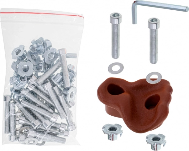 Монтажът е лесен и бърз – в опаковката има пълен комплект монтажни аксесоари. Хватките имат груба повърхност за стабилен захват и заоблени ръбове за по-голяма безопасност. Идеални за домашни катерачни стени, дворни съоръжения и детски стаи.