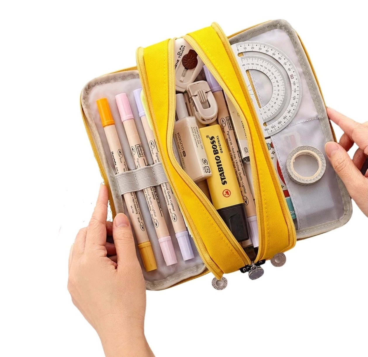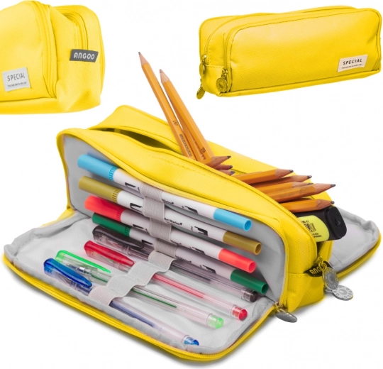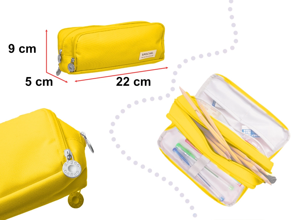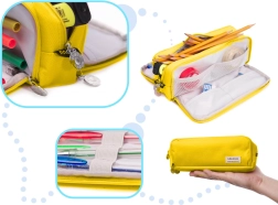 Практичен трикомпонентен несесер 3в1 за училище, офис и пътуване. Благодарение на трите отделения с цип всички пишещи принадлежности остават подредени и сигурно съхранени. Вътрешните джобчета и еластичните ластици гарантират, че всеки аксесоар ще има своето място. Компактните размери спестяват място в раницата, а издръжливият полиестер осигурява дълъг живот. Многофункционално приложение, 3 отделни отделения, издръжлив материал и перфектна организация.