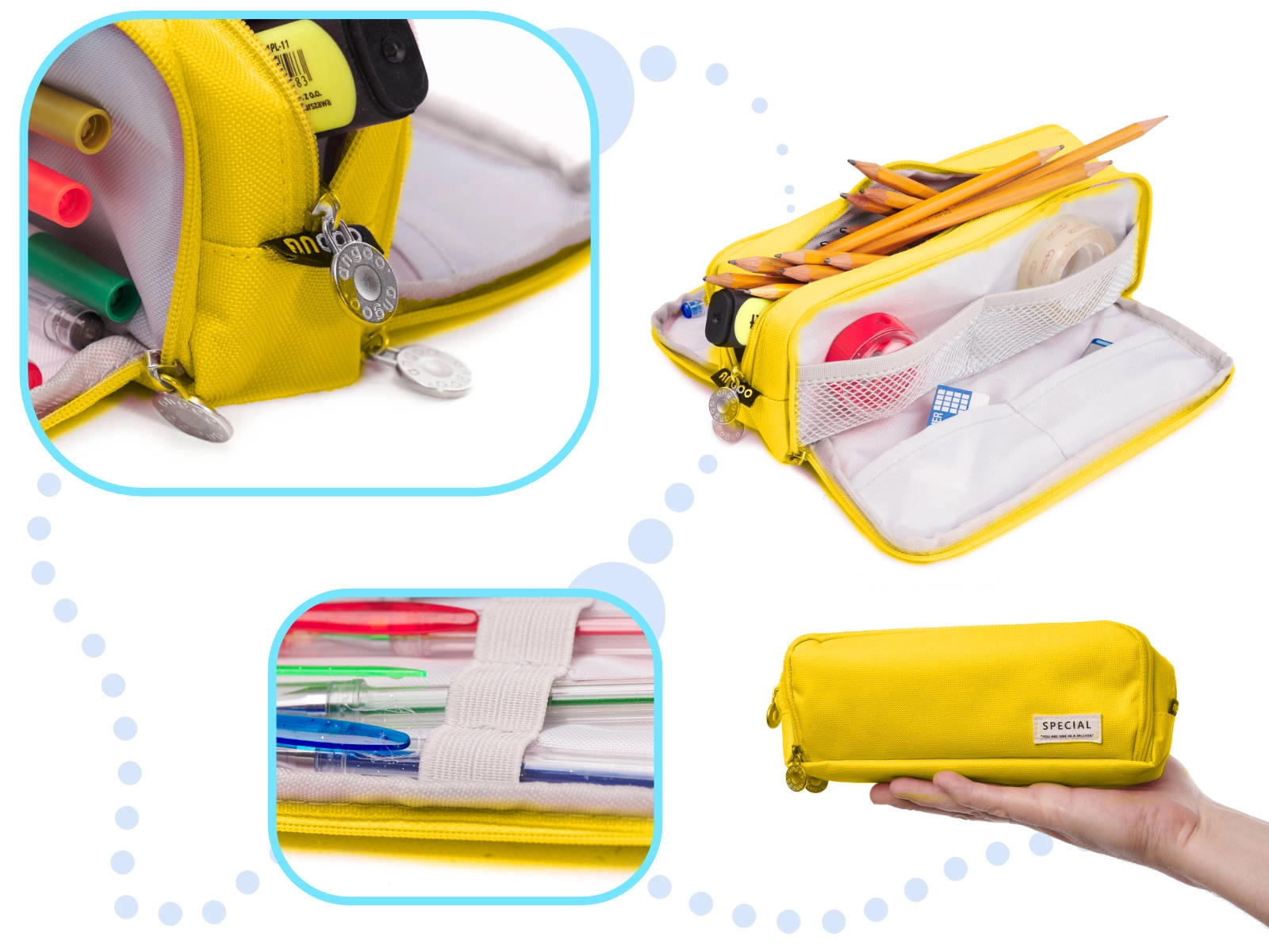 Край на хаоса в раницата. Този мултифункционален несесер с 3 отделни отделения с цип побира моливи, химикалки, маркери, линийка и дребни вещи. Благодарение на вътрешните джобове и еластичните ленти всичко е под ръка и перфектно подредено. Отличен е и като козметична чантичка или пътнически органайзер.