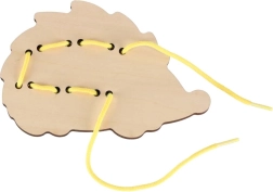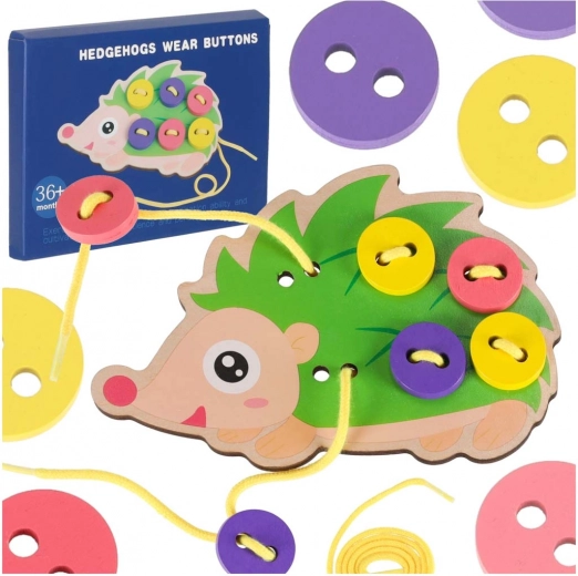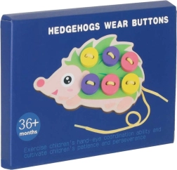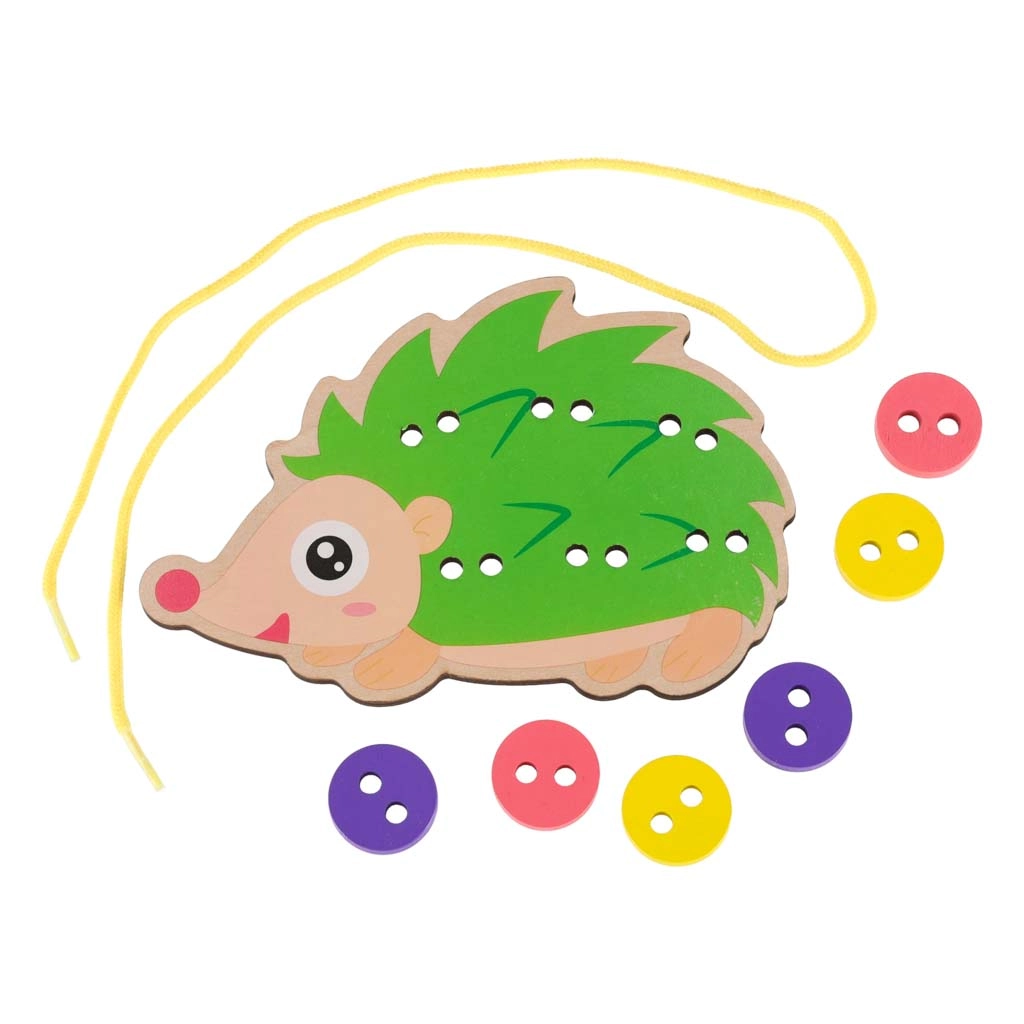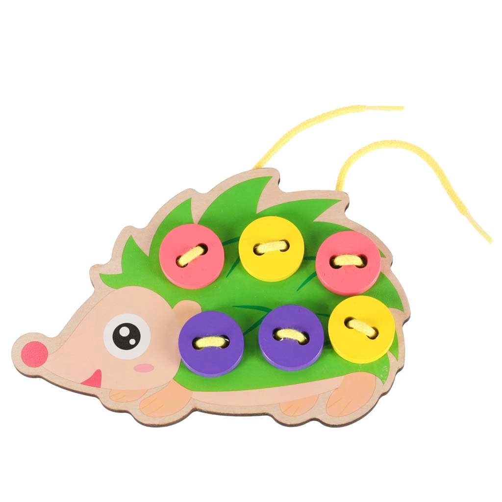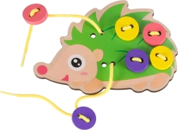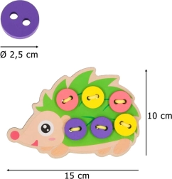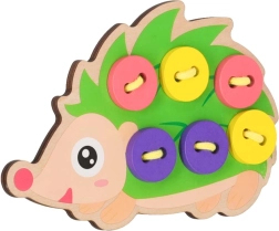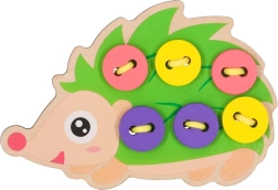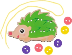 Този таралеж за промушване е идеален помощник за първите стъпки в връзването и „шиенето“. Децата промушват връвчицата през отворите и закрепват цветните копчета върху „игличките“ на таралежа. Веселите, наситени цветове естествено приканват към игра и учат да се различават цветове и форми.